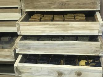 Nos savons sont fabriqués en côte d'Ivoire dans notre atelier d'Abidjan, selon le processus de saponification à froid. Après le démoulage, nos blocs de savon sont découpés en pains de savon d'environ 120g chacun. ils sont ensuite placés sur nos étagères en teck brut pour une période de cure d'environ 6 semaines. La cure est une étape essentielle pour obtenir un savon, doux à la mousse onctueuse et généreuse. La cure permet au savon de développer toutes ses qualités. Pendant la cure le processus de saponification va se poursuivre: l'eau va s'évaporer, la soude va finir la transformation des huiles en savon et va donner naissance à la glycérine tant précieuse dans les savons. Tous nos savons sont surgras entre 8 et 10%. Cela signifie qu'il y a un surplus d'huile qui ne sera pas transformé en savon et va contribuer à la protection de la peau.